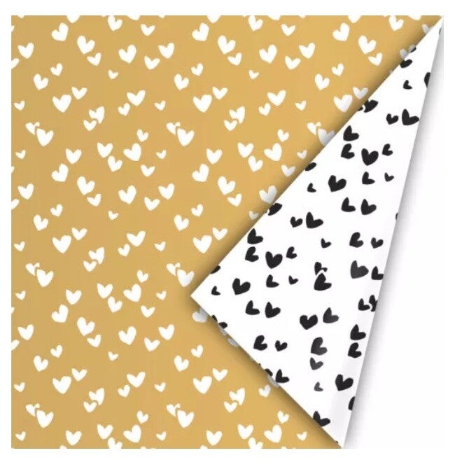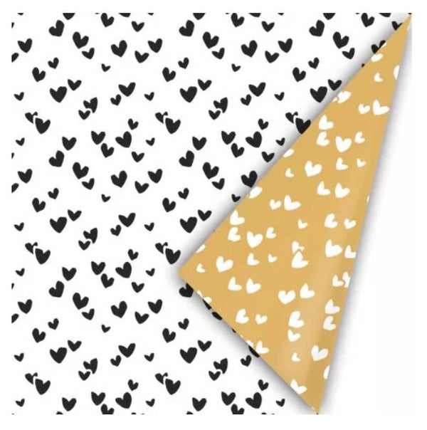 Pak je kadootje hip en liefdevol in met dit prachtige dubbelzijdig vrolijk cadeaupapier met hartjes print in het goud zwart en wit.
