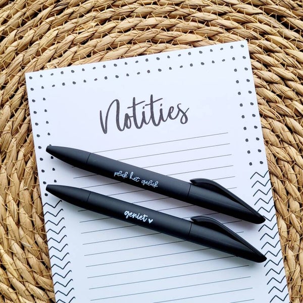 Met deze mooie, mat zwarte pen met tekstopdruk "Pluk het geluk' is schrijven een feestje.